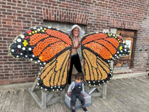Kelly Frankenberg provides the best photo op at the Stone Arch Festival with her 5 foot tall monarch butterfly made from recycled materials. Learn about the history of the Monarch to the river.