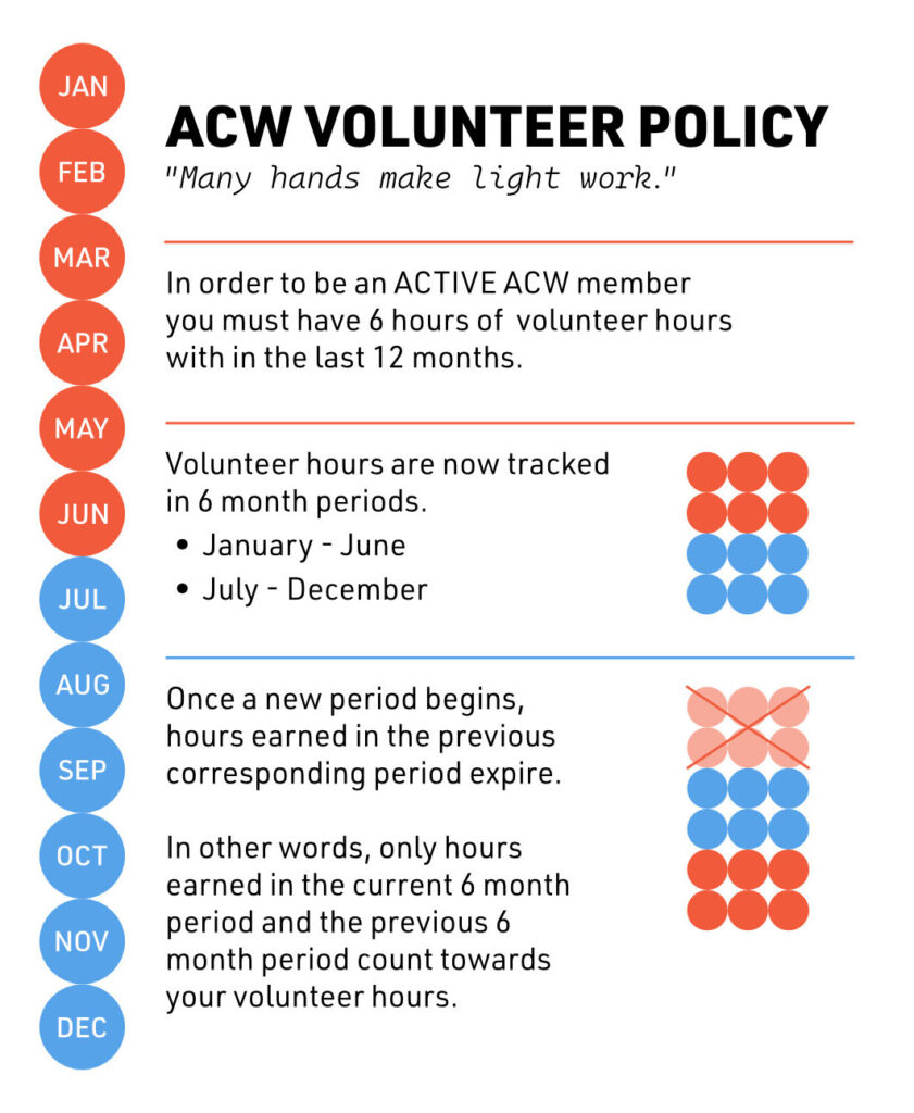 Required to be an ACTIVE ACW member. You will need 6 hours of volunteer time in a 12 month period. We divide the year from January – June and July and December. You can roll your volunteer hours from July- December into January-June.