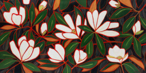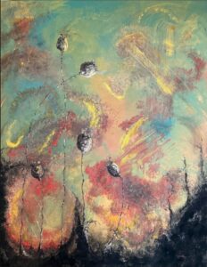 This painting was inspired by the folk song “Where Have All the Flowers Gone?” by Pete Seeger and Joe Hickerson. The song, and the painting, are a reflection of life; more specifically life in a war torn society. The painting represents the pods of poppies, frequently used to symbolize the sacrifice of soldiers who are killed in war.