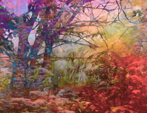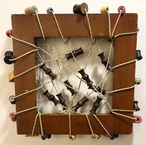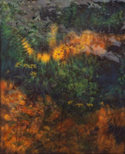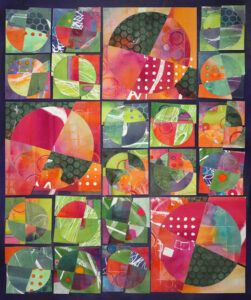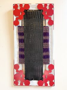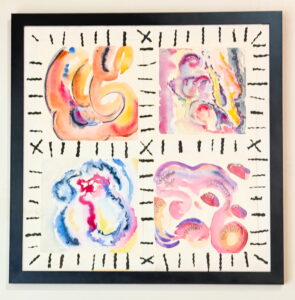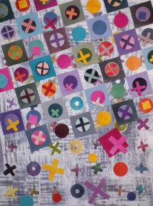 “Fragmented Play” is constructed of several layers, beginning with the wood, layered, watercolor paper and a mixture of watercolor and acrylic paints. Layers of paint, glaze, marker and impressions of non-recyclable plastics were used in this process. It may be hung vertically or horizontally to best suit it’s installation. space.