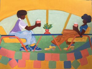 As a Black artist I want to show Black joy instead of focusing on the trauma and dark history of our people. I enjoy working in many layers and being able to see the layers peaking through which is really an analogy to the human condition and people being complex and made up of so many layers. We are not a monolith and have full range of emotion and complexity.