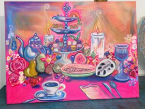 To Be Fruitful is a radiant painting that celebrates self-love, growth, and spiritual abundance. Showcasing a lush arrangement of colorful fruit, gentle lights, and glowing candles, the artwork symbolizes the journey of inner healing and personal transformation. It invites viewers to embrace their own potential for nourishment and renewal, highlighting the beauty of cultivating self-compassion and the richness that comes from within.