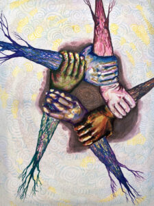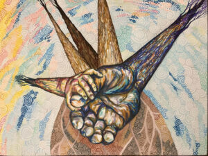 “Renewal” captures the profound journey of healing and transformation through the vibrant portrayal of a woman with her eyes closed, tears streaming down her face, and hands raised in praise. This piece embodies the duality of sorrow and joy, illustrating that tears can be a powerful expression of release and gratitude. The explosion of color surrounding her symbolizes the richness of life and the beauty that emerges from vulnerability. The act of raising her hands signifies surrender to the process of renewal, embracing both the pain and the joy that come with it. This artwork serves as a reminder that true renewal often arises from our deepest struggles, inviting viewers to reflect on their own paths to healing and the strength found in vulnerability.