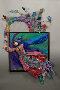 This three-dimensional wall piece is a tribute to all the amazing teachers that work with kids to teach them to read. My daughter struggled to learn to read, possibly undiagnosed dyslexia so when her fifth grade teacher was finally able to bring her the skills she needed she really soared! Now she is a children’s librarian! Every time I look at this piece I think of this teacher and many others that make such a difference in student’s lives.
