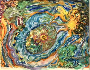 Description: I painted this on the summer solstice in my garden. The solstices and Equinoxes of the year are very important to me spiritually. Summer is a time of happiness and abundance for me, and I wanted to show the feeling of the garden in summer- full of abundance and possibilities- so many that they swirl around you- in this painting.
