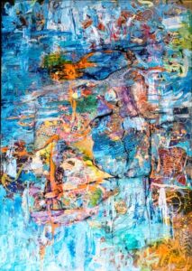 Vibrant blues flow across the canvas like ocean waves, with splashes of orange, green, yellow, and white that mimic sunlight dancing on water. Sweeping lines and layered shapes create a sense of movement and depth, like currents swirling beneath the surface. The painting captures the energy and rhythm of the sea, inviting viewers to dive into an abstract world where ideas float and drift like waves in the ocean.