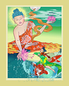 When faced with challenging times, I have often found myself in need of balance and support.  Over time, I’ve developed deep connections with nature, spirituality, and the arts, especially music.  For this piece, I  created an image of a powerful, compassionate Buddha channeling the power of music to a female violinist, riding a radiantly beautiful orange koi fish.  It’s good to know that in troubling times, we can learn to call on our personal symbols, whatever they may be, to imbue us with  comfort, security, and peace of mind – and the willingness to endure our challenges with grace and gratitude.