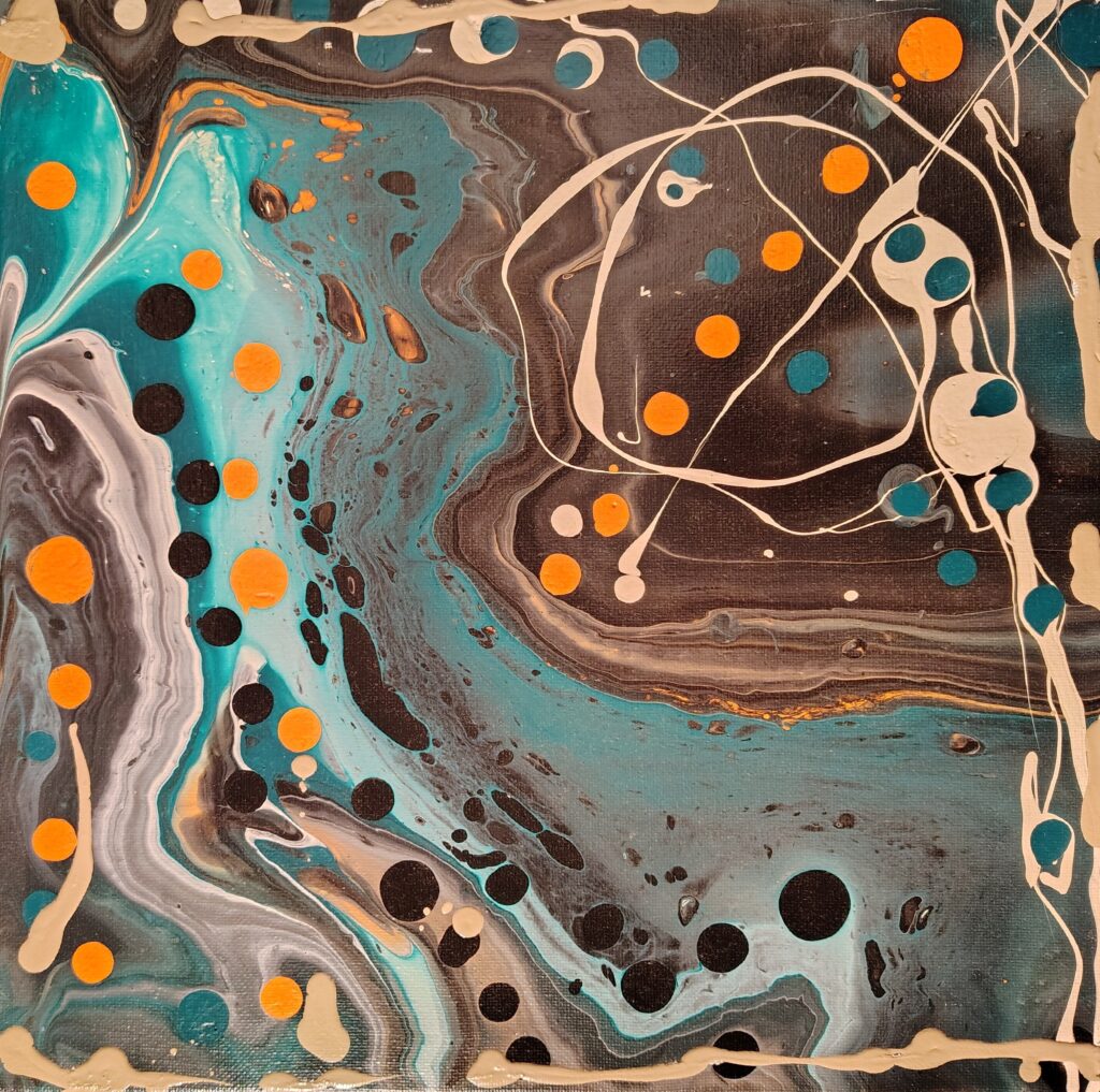 Pour Painting description: Using fluid paint and mediums to create unique and interesting abstract painting compositions on canvases or panels.