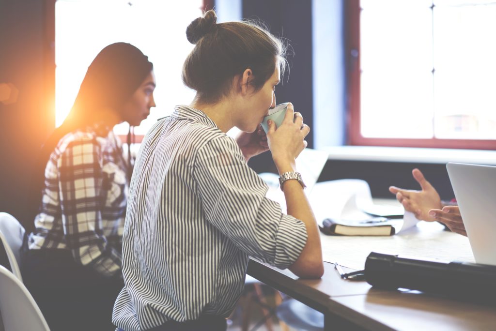 Previous | Next Young female manager enjoying morning coffee for breakfast drinking it during council with colleagues reporting about improvement in job and increasing sales using laptop computer for presentation