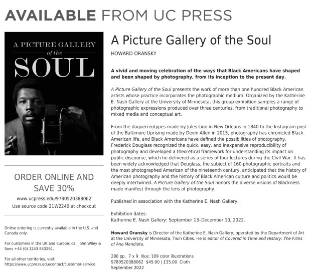 « All Events This event has passed. A Picture Gallery of the Soul (Sept. 13-Dec. 10) September 13, 2022 @ 8:00 am - 5:00 pm « Maker Space @ Haven House Maker Space @ YMCA » A Picture Gallery of the Soul by Howard Oransky (Editor), Herman J. Milligan Jr. (Contributor), Cheryl Finley (Contributor), crystal am nelson (Contributor), Seph Rodney (Contributor), & 2 more September 2022 First Edition Hardcover $45.00, £35.00 TITLE DETAILS Rights: Available worldwide Pages: 280 ISBN: 9780520388062 Trim Size: 7 x 9 Illustrations: 109 color illustrations See at Katherine E. Nash Gallery Sept. 13-Dec. 10. Add to calendar Google Calendar iCalendar Outlook 365 Outlook Live Details Date: September 13, 2022 Time: 8:00 am - 5:00 pm Event Category: Art Show/Exhibition