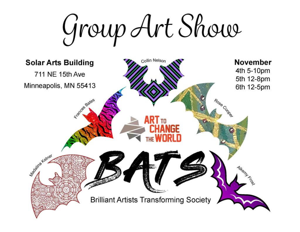 The Glitter Renaissance Group is going to be hosting an art show in the Fox Den at Solar Arts Building. It will be the first weekend in November during the Fall Open Studios event. We came up with the acronym BATS or Brilliant Artists Transforming Society to show that no matter what style of art you create it can make a difference in the world. You will get to see a variety of art from paintings to sculptures to illustrations. Come join the BATS for a weekend of fun!