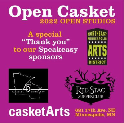 When studios in Northeast Minneapolis open for the weekend of November 4-5-6, visitors can purchase cocktails at the basement Speakeasy at Casket Arts building, 681 17th Ave. NE during Open Casket. Speakeasy is open 5-10 pm on Friday, Nov. 4, 2-8 pm on Saturday, Nov. 5, and noon-4 pm on Sunday, Nov. 6. Speakeasy profits go to support Northeast Minneapolis Arts District. ACW members Margo Ashmore, Josh Blanc, and others are on the Arts District board, with a mission “to catalyze the innovative spirit of artists through generative community development.” Dedicated to making the geography look more and more like an arts district, increasing the number of artists and arts organizations in the area, and offering artist opportunities such as airport exhibits and the Northeast Calendar. Voted #1 Best Arts District by USA Today’s 10Best Readers’ Choice Travel Awards. Find out more during Open Casket!