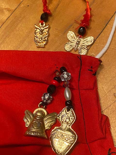 44 red silk with milagro heart from Petatlan Mexico church and angel . Owl and butterfly charms on back ribbon D $30.00