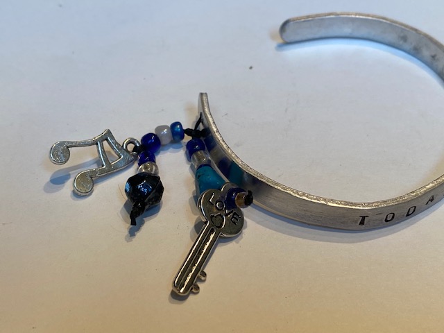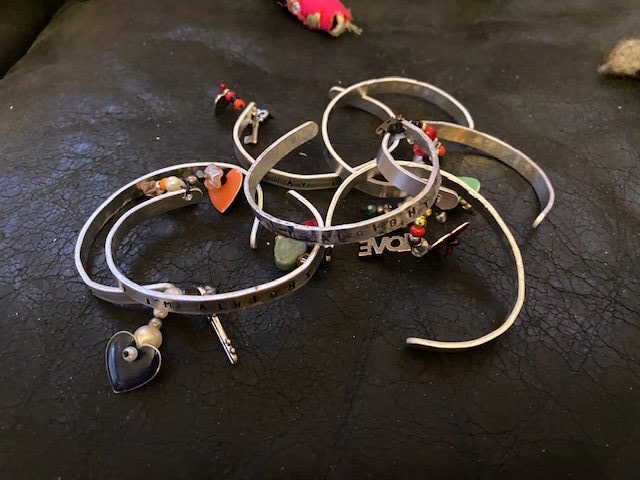We made these very hip bracelets as a token for workshop participants to remind themselves that “Today, I’m Alright”. Skyler, my studio assistant, suggested we “distress” some them (beat them up). This, of course, adds extra meaning (and hipness) ; /0