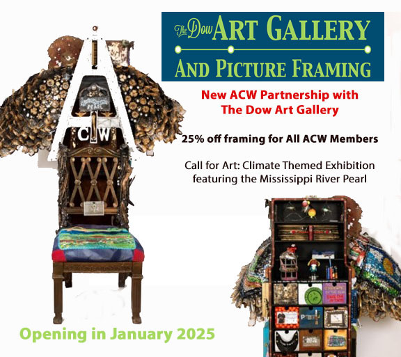 ACW is thrilled to announce a new partnership. All ACW members will receive 25% off all framing and are invited to submit works to be included in a January 2025 Exhibition. Opening is January 17, 2025 Jodi Janz will be the ACW Project Manager. Please email Jodi for details. jodijanzart@yahoo.com Submissions due by December 26. You may submit 4 works. Drop off date for accepted works is Jan 2. See Submission Criteria: https://www.arttochangetheworld.org/submission-criteria-for-the-earth-exhibition