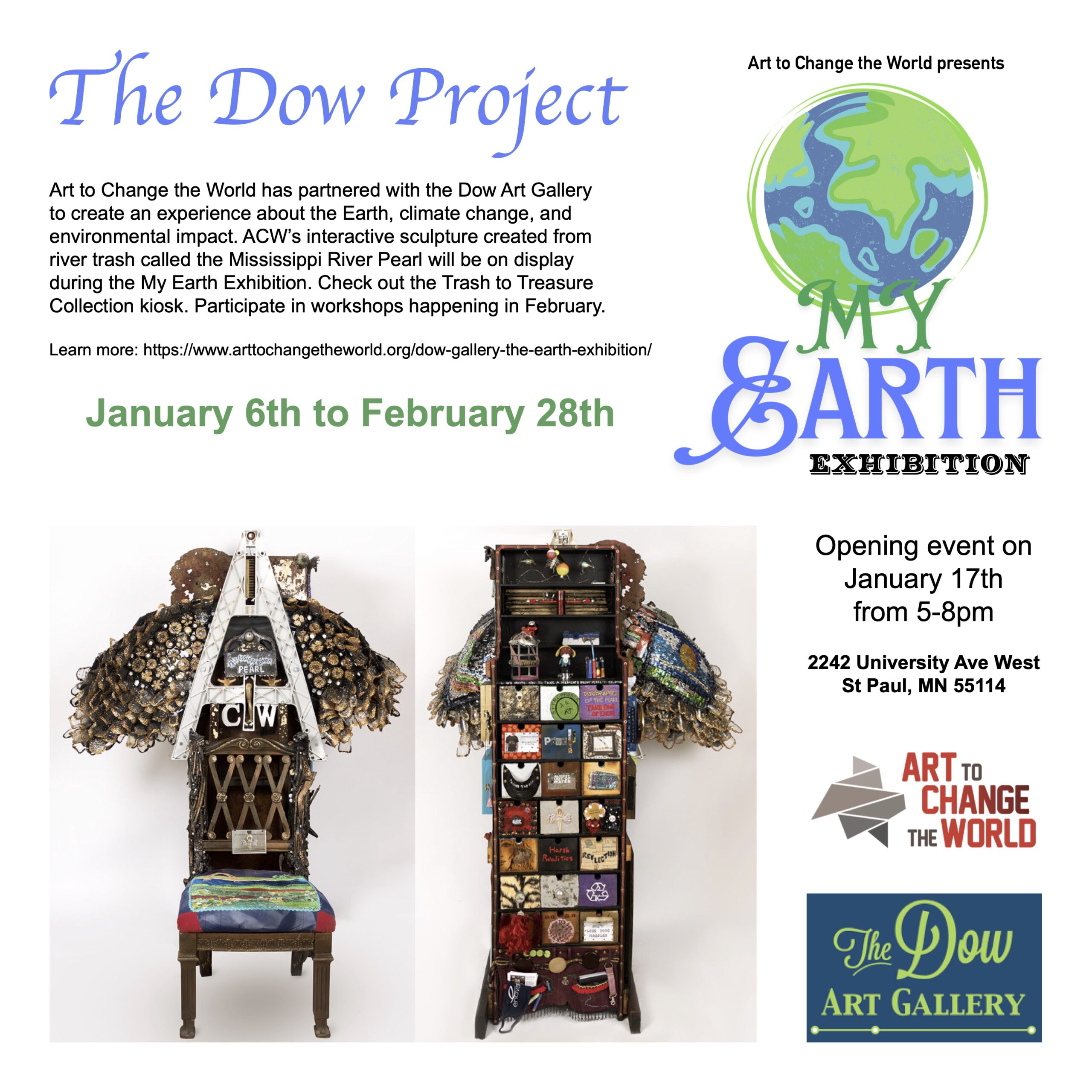 Art to Change the World has partnered with the Dow Art Gallery to create an experience about the Earth, climate change, and environmental impact. ACW’s interactive sculpture created from river trash called the Mississippi River Pearl will be on display during the My Earth Exhibition. Check out the Trash to Treasure Collection kiosk. Participate in workshops happening in February.