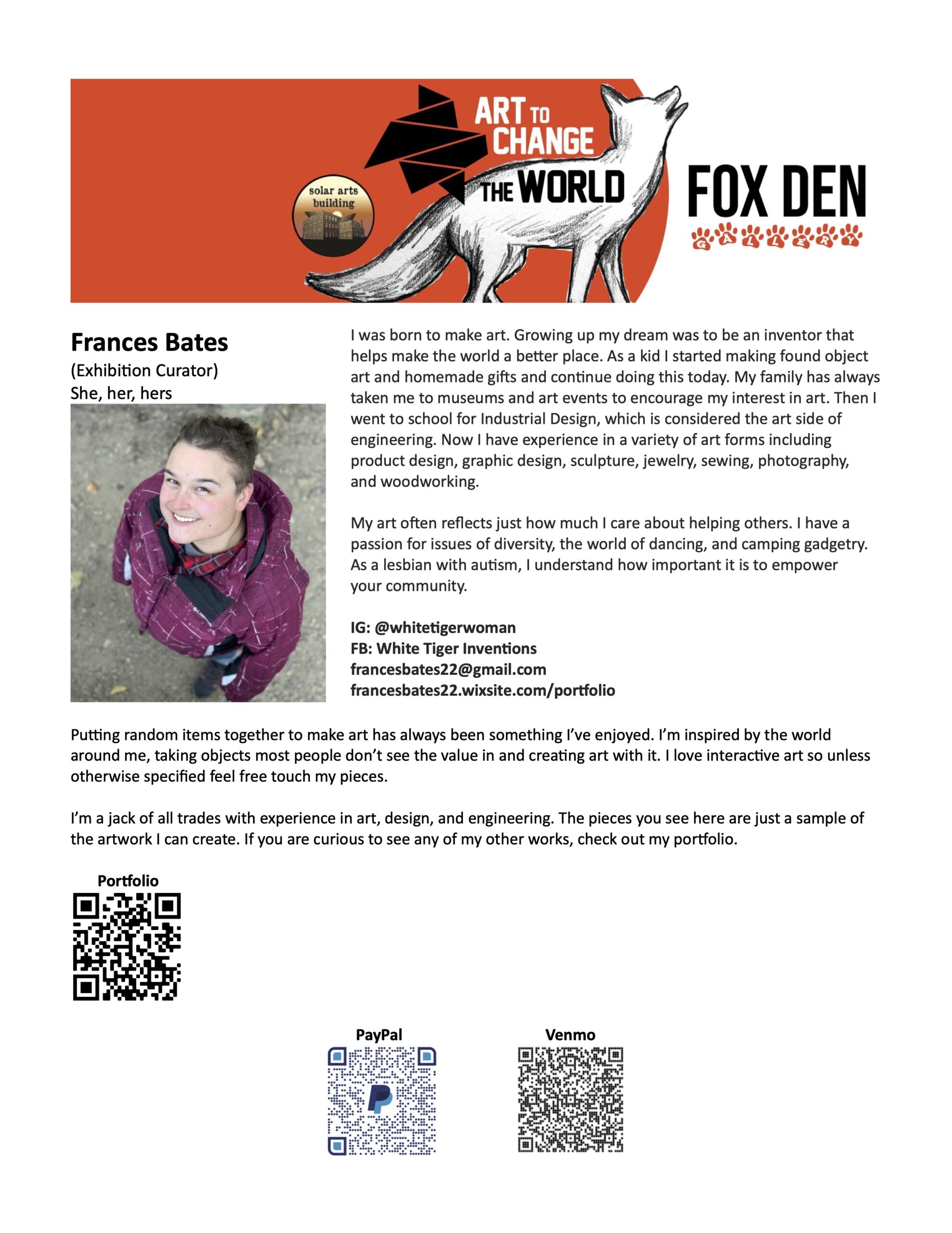 In the Fox Den Gallery we use artist plaques to talk about the artist, their work, and how to someone can purchase the piece. Please send a photo of yourself, artist statement, contact info, artwork description, and QR code. Send these directly in an email with no formatting. See example below.