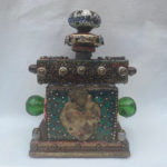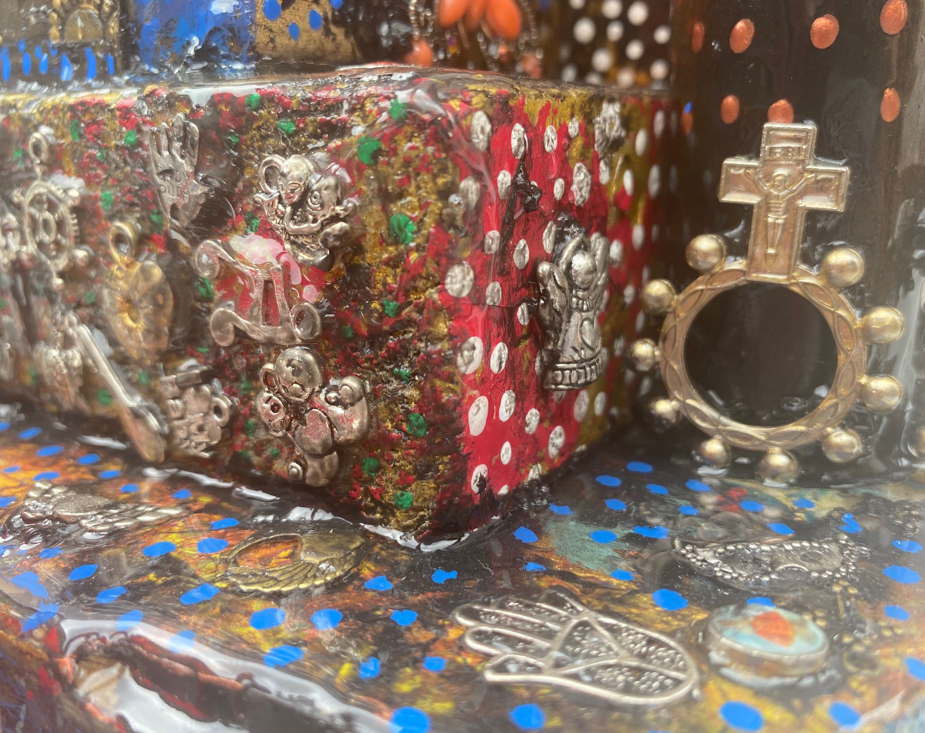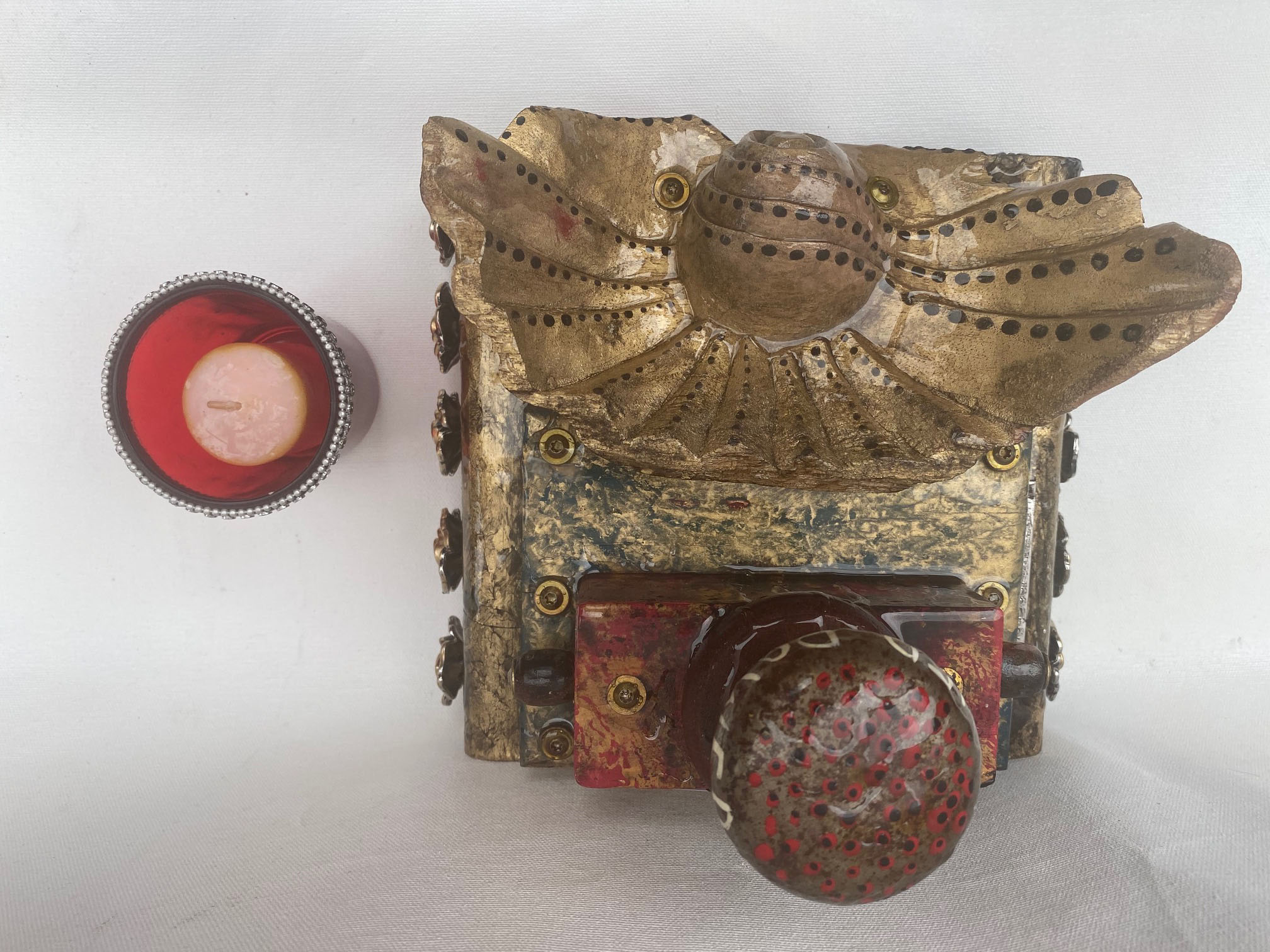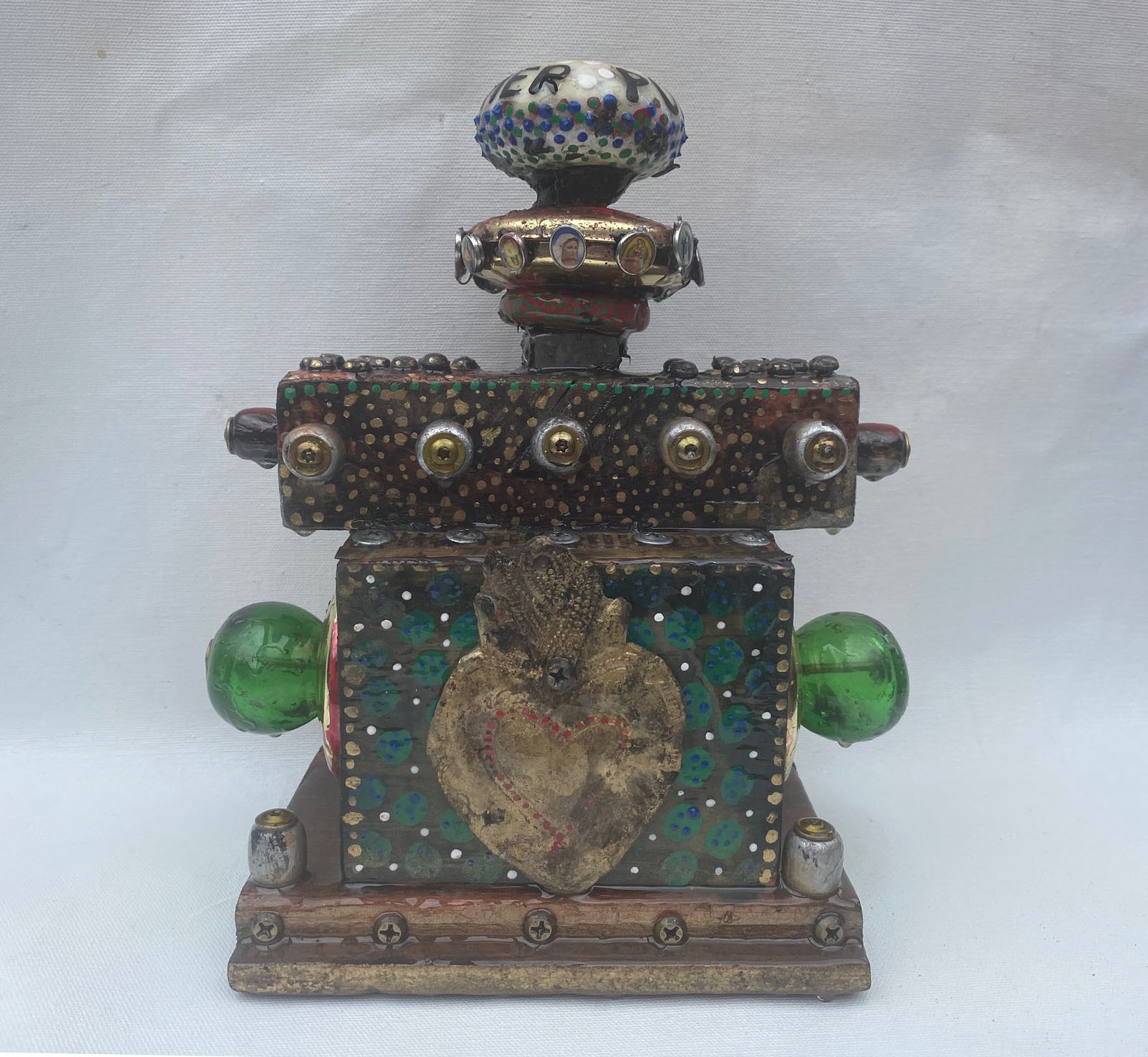 Antique Porcelain Door Knob, Beads, large milagro heart, dozens of screws holding the life you create together. #10 has a 360 degree presentation. Giant green crystal beads focus on the saints guarding the structure symbolize the beauty of life. The life YOU create to promote your well being. Finished to look as if there has just been a purifying rain. Includes a votive candle and holder. Click to enlarge.