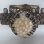 Antique Brass Door Knob, Beads, embossed metal. Guarded by two Tree of Life sentries, the winged hearts encourage the viewer to let their spirit take wing and find a new path to joy. The five gold milagro hearts are a five time prayer supported by the three roses below. Milagros were charms/totems historically made from silver, and now generally pewter. It is a Catholic tradition to buy Milagros to help heal medical or psychological problems. Historically, they would then be attached to a large velvet hanging in the church. Today, they are more generally pinned to the supplicant’s clothing Includes a votive candle and holder. Finished to look as if there has just been a purifying rain. Click to enlarge.