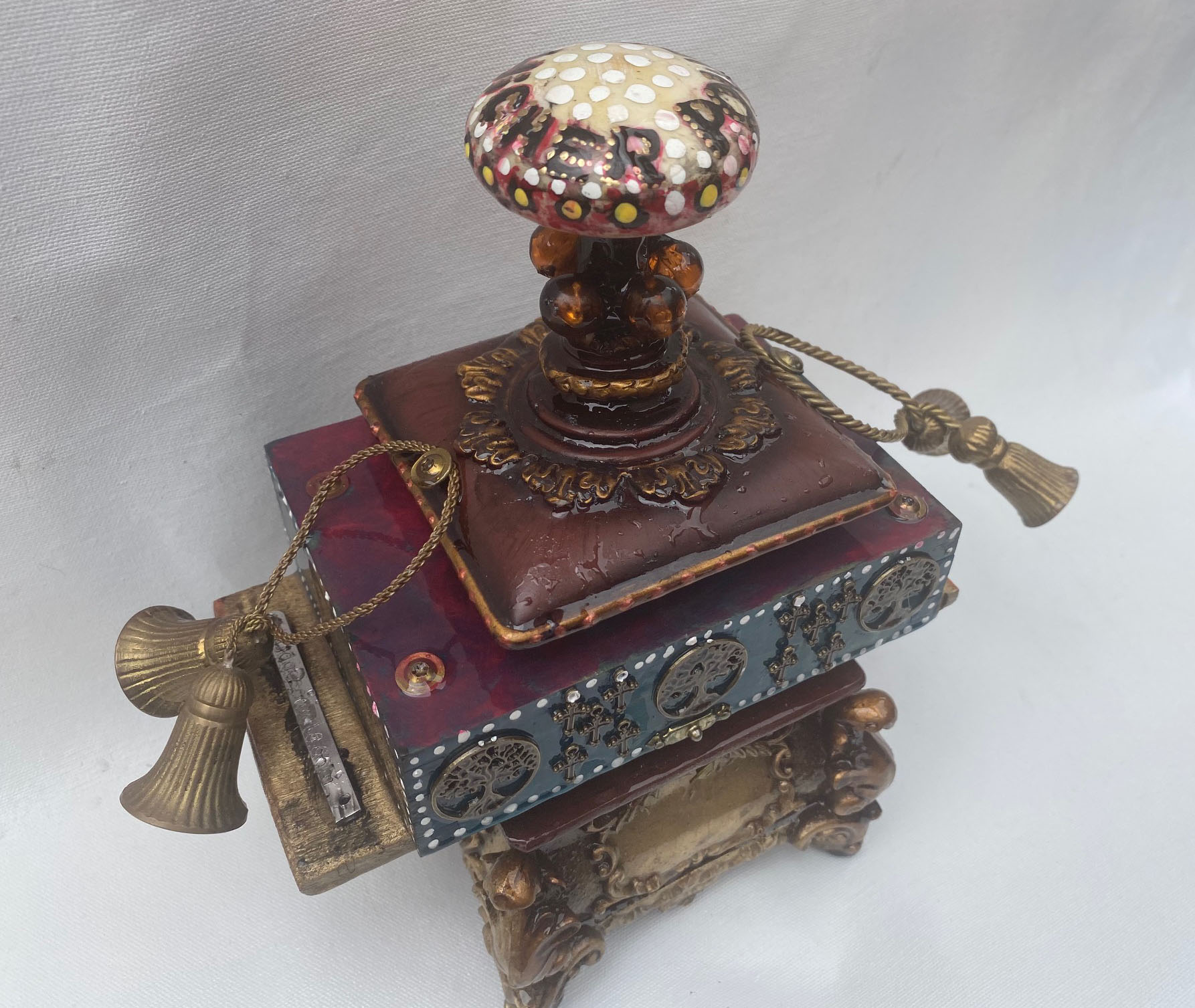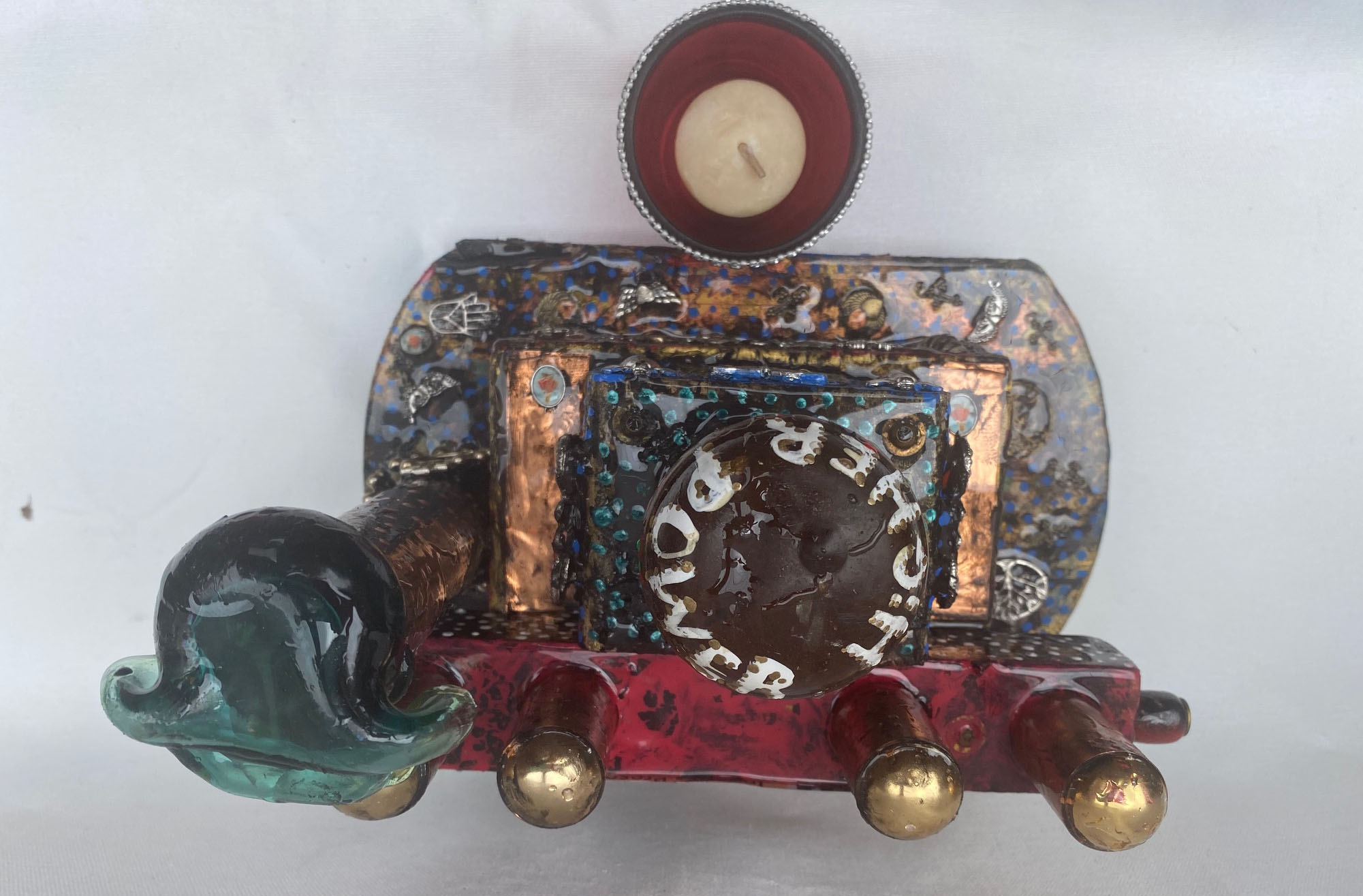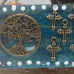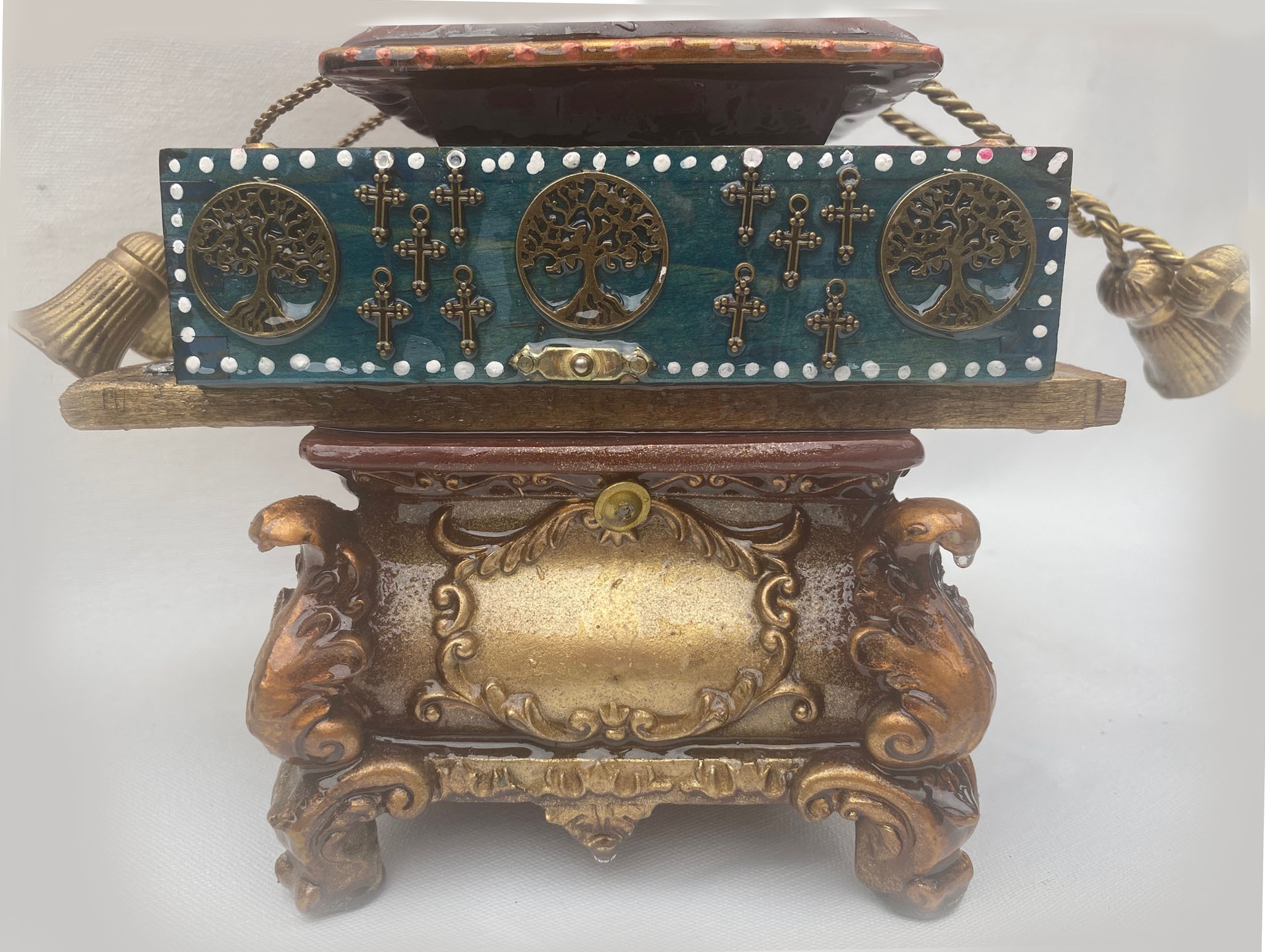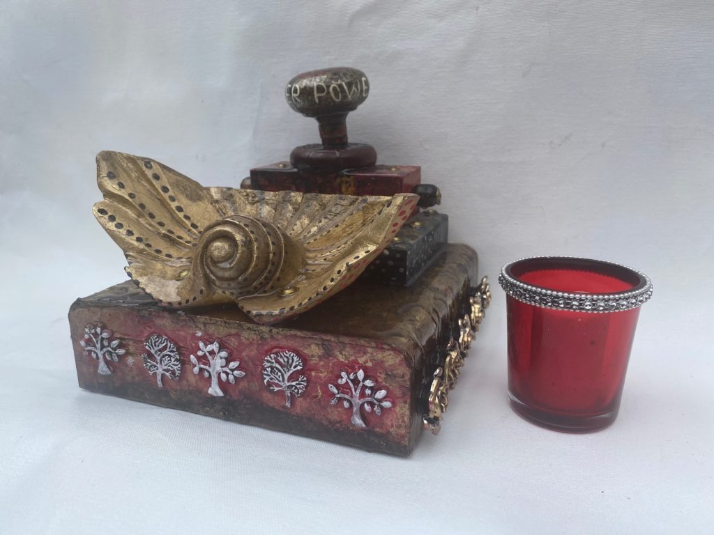 Antique painted Brass Door Knob, Beads, embossed metal, resin roses. The roses represent love of life and the planet which is displayed by different Trees of Life representing the continents. The spiral in altar #12 inspires the the viewer to move on from being ego focused to being enlightened. Includes a votive candle and holder. Finished to look as if there has just been a purifying rain.