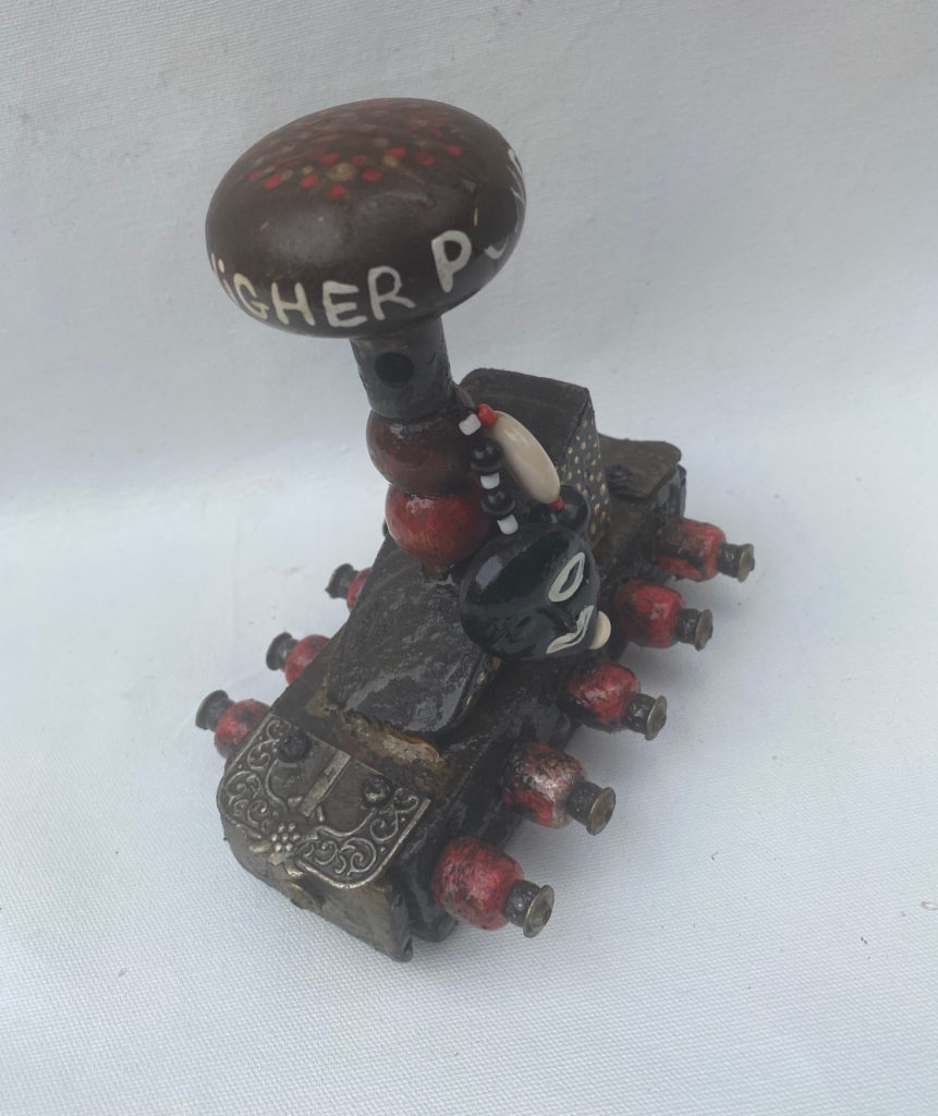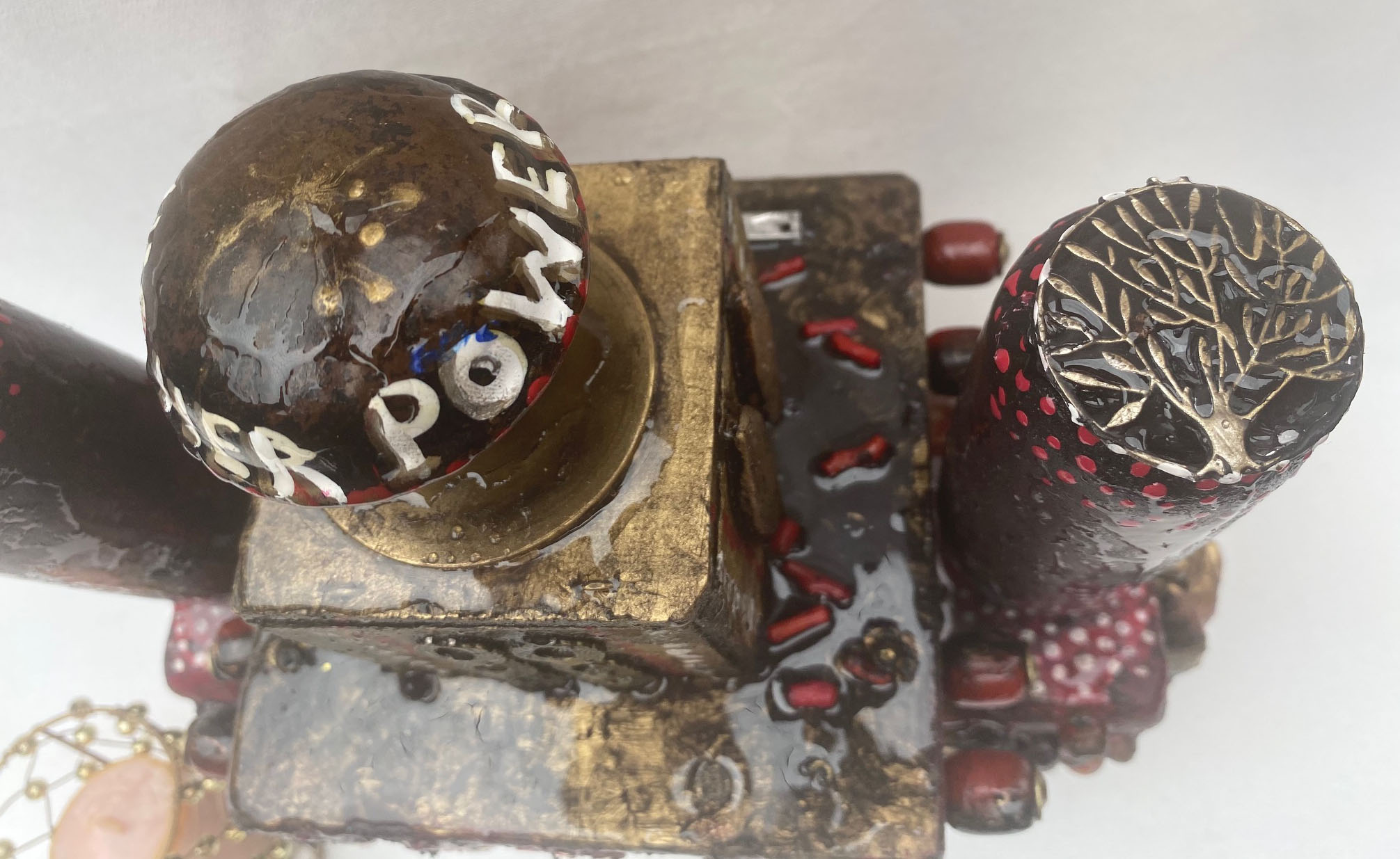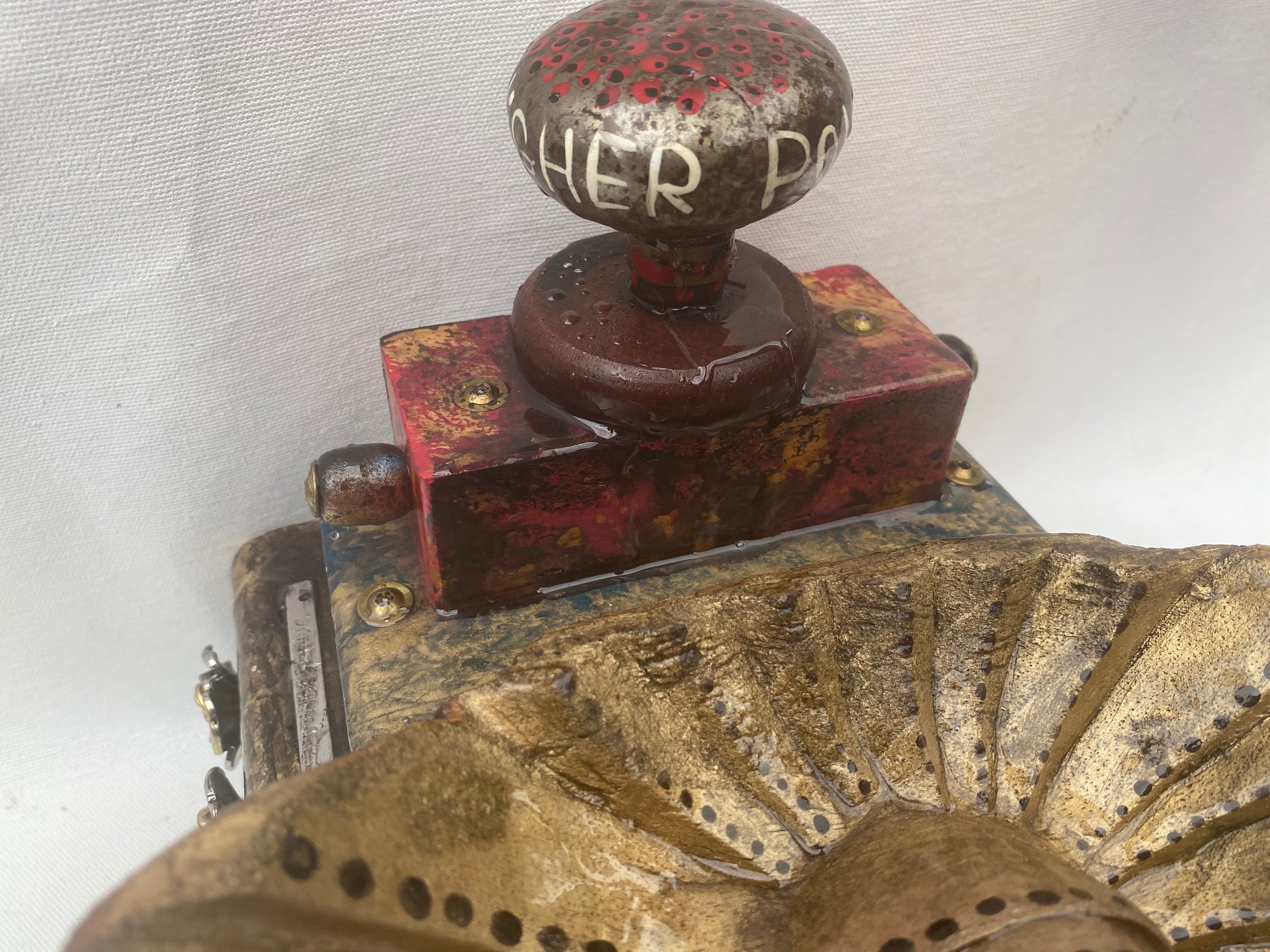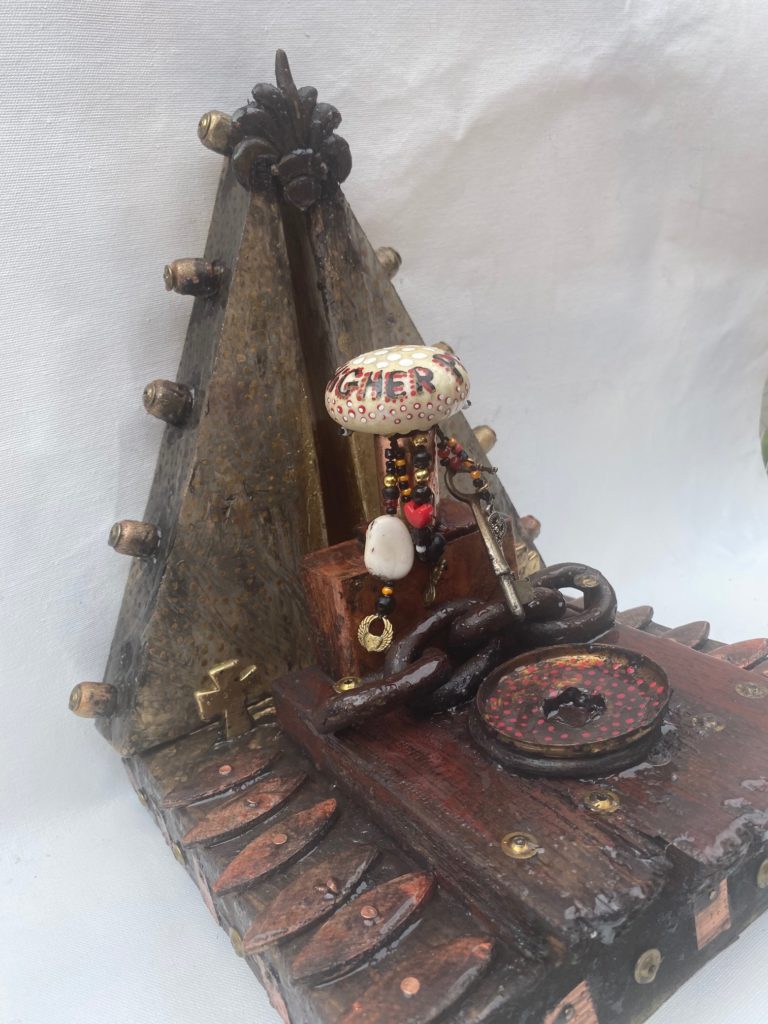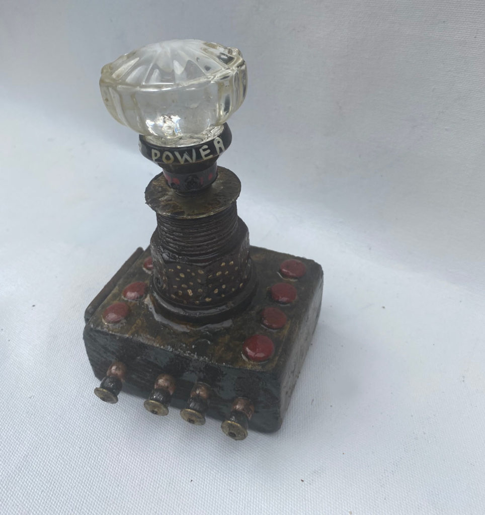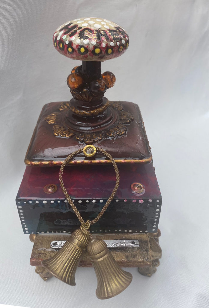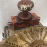 Higher Power Door Knob Altars Everyone who has ever been to a 12 step program has heard that if you do not believe in a G(g)od(s), you can choose anything for your higher power – even a door knob. As I created these door knob altar sculptures, they became little soldiers for me, fighting against the effects of all trauma. All altars are created to give the appearance of aged patina.