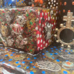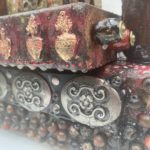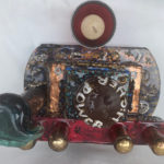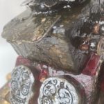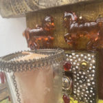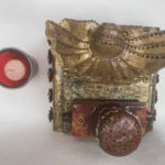 A Mexican themed altar encrusted with Milagros (milagro is Spanish for miracle. Milagros were charms/totems historically made from silver, and now generally pewter. It is a Catholic tradition to buy Milagros to help heal medical or psychological problems. Historically, they would then be attached to a large velvet hanging in the church. Today, they are more generally pinned to the supplicant’s clothing. Four copper soldiers guard your well being. This altar includes a votive candle. Finished to look as if there has just been a purifying rain. Includes a votive candle and holder. Click to enlarge.