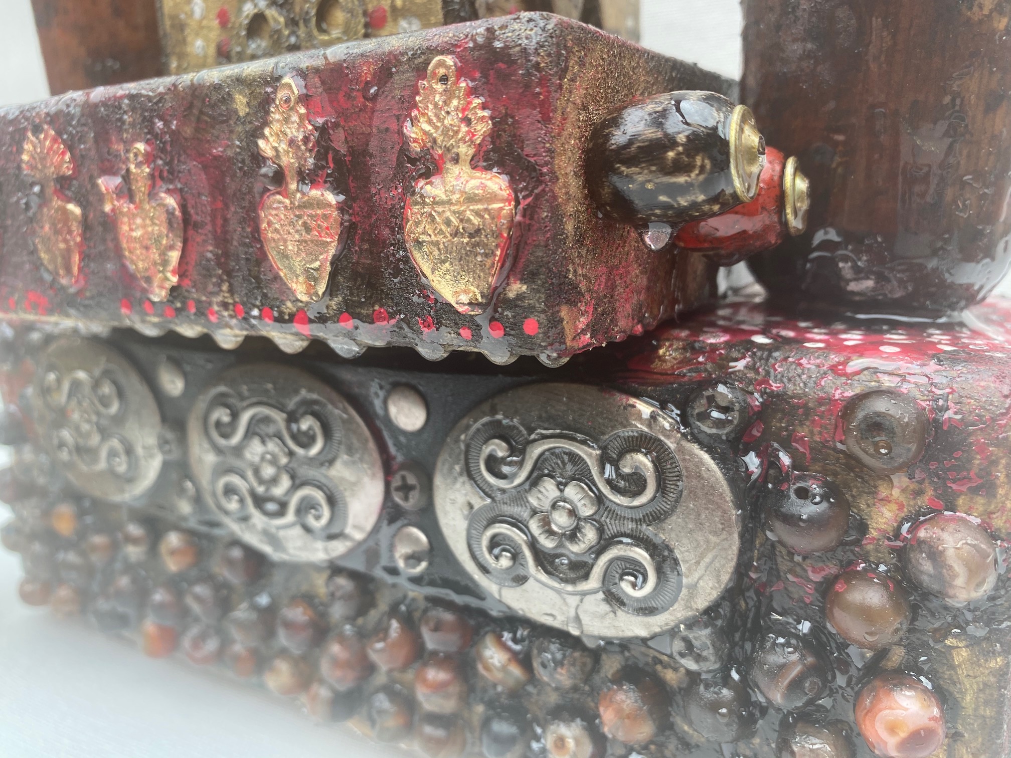 Antique Brass Door Knob, Beads, embossed metal, antique keys, Tree of Life, Resin Skulls, red heart beads. Ring made from Made with Love Hearts.