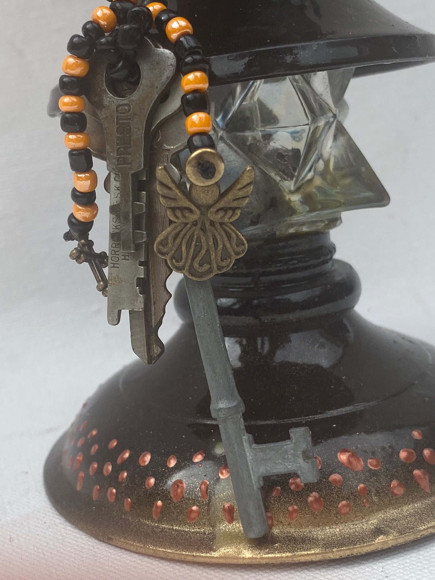 Antique Porcelain Door Knob, Beads, chain, antique keys, copper, stone cross, fleur de lis.