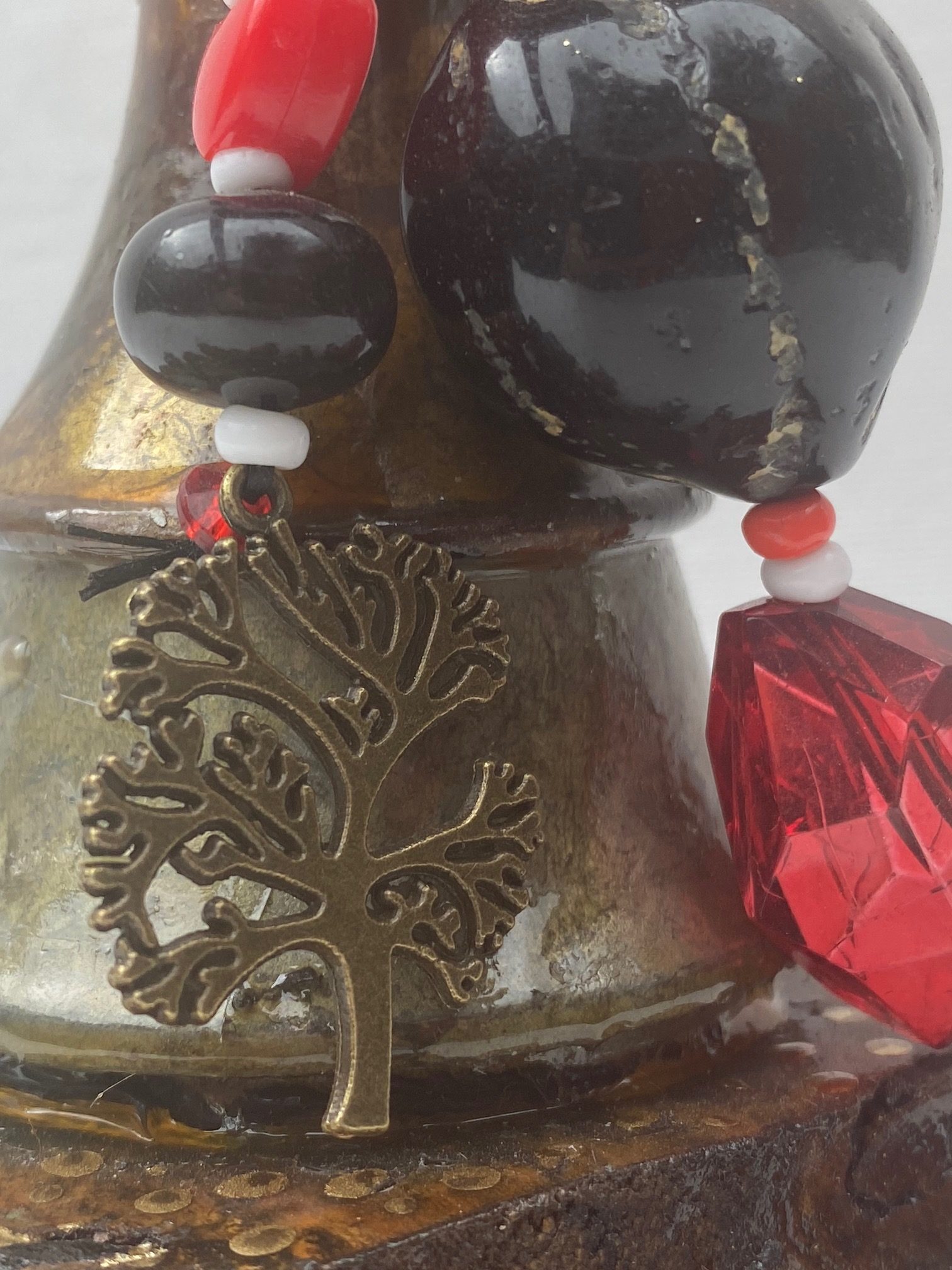Antique Brass Door Knob, Beads, embossed metal, antique keys, Tree of Life and Ruby Crystal