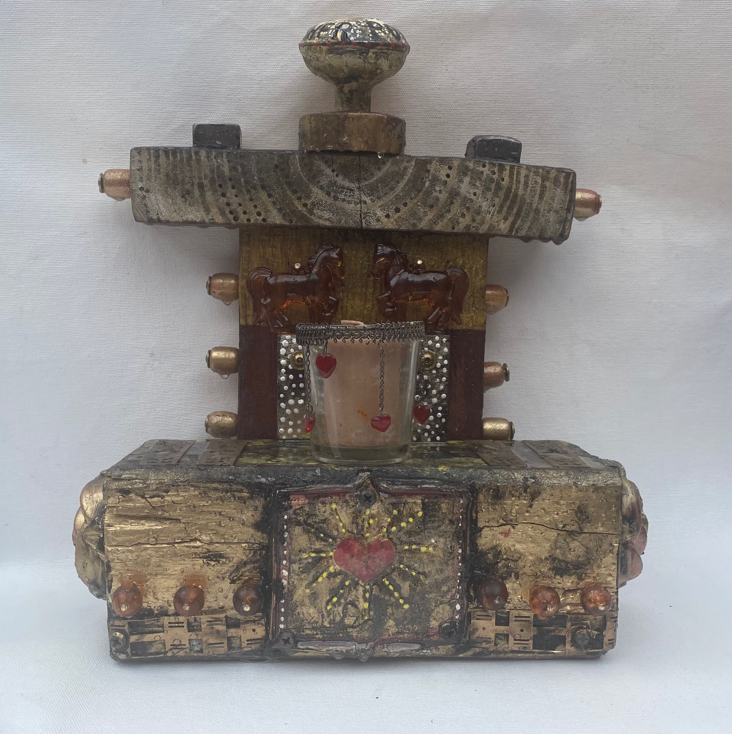 Antique painted Brass Door Knob, Beads, embossed metal, amber beads and horses, resin heart milagro.