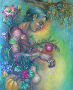 Symbolic of creative energy, healing, and fertility, Flora honors my grandmothers who worked the land alongside their husbands and children to sustain their families and bring grace and beauty into the world. This contemporary Flora is inspired by essentialist feminist theory and my life experiences as a woman. I reclaim the feminine counterpart of the Creator, long ago usurped by patriarchal dogma. I honor all of the women who have fought against misogyny and those who continue to work to gain equality for all genders.