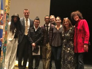 Jill Waterhouse worked with Vice Principal Isabel Rodriguez to create this ceremony. Attending the ceremony titled “Lighting the Torch for the Compassionate Dream” were over 100 students, faculty and administration – including Ed Graff, Superintendent of Schools. All witnessed the powerful and moving performances of the three winning student essayists and were amazed and delighted by the finished peace post. Isabel Rodriguez hosted the event and collaborators, Jill Waterhouse, FE Love, Herman Milligan, Jr. and beloved former South High art teacher, Denny Sponsler, were guest speakers. In addition, City Council Vice President, Andrea Jenkins, who had been invited but was unable to attend, sent an empowering message to the students which ended with this challenge: “Many people, many young people like yourselves, have been and continue to be engaged in the struggle for equality, fairness, and justice all around the world. So I encourage you to continue to stand strong in the face of adversity, to be intersectional in your approach, and to be fearless in your advocacy. Your work matters, your voice matters, and your lives matter.”