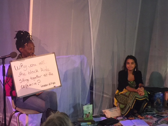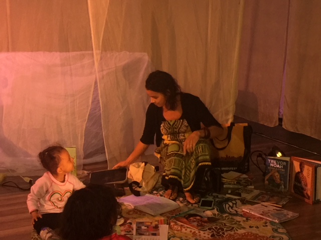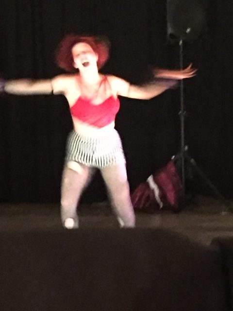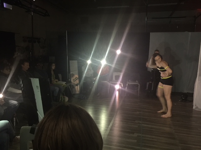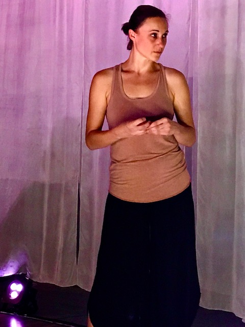 Danielle dancing with tape measure costume and cell phone lights to communicate Grace’s concern with body image and device addictionGrace with her panel on body imageLayl’s Workshop
