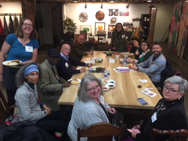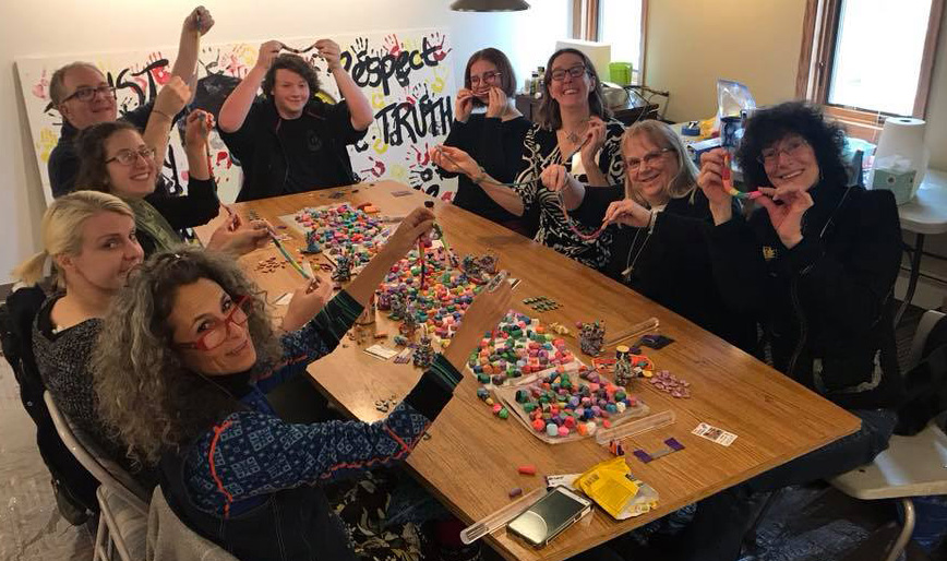 Morgan and Anne in the ever popular cove of heart ListeningThe composerElijah contemplatingJill’s jacket says it all (All Together) as she chats with new member William WhiteKate Fisher talking about motherhoodNew member Nancy in the middleRhonda, Kate and Shira Richter talking about the cultural challenges of motherhoodWith topic Expert Veronica