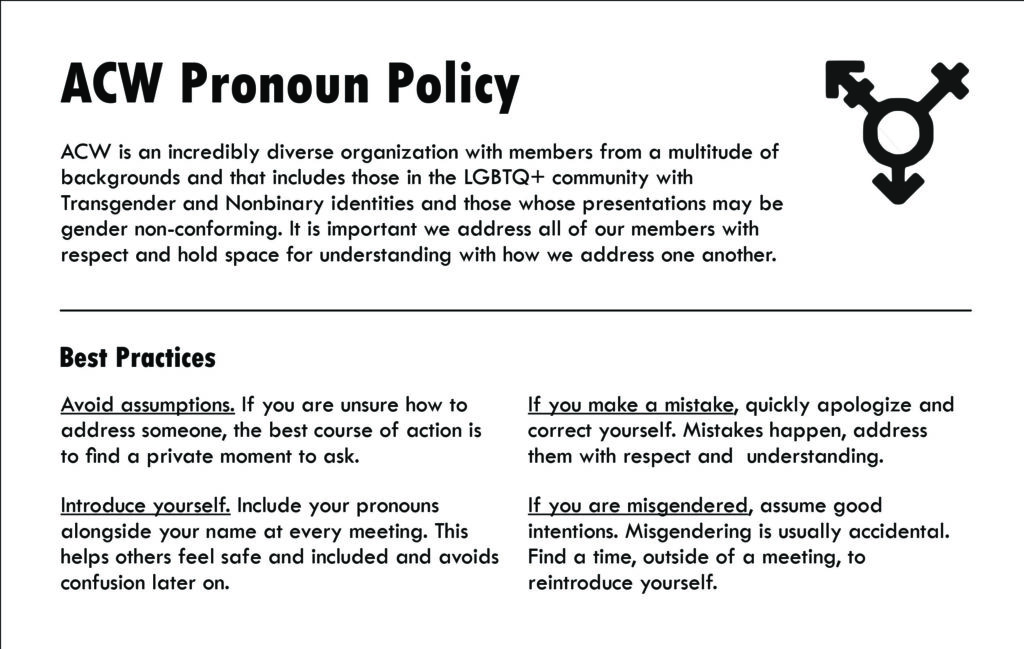 - ACW is an incredibly diverse organization with members from a multitude of backgrounds and that includes those in the LGBTQ+ community with Transgender and Nonbinary identities and those whose presentations may be gender non-conforming.