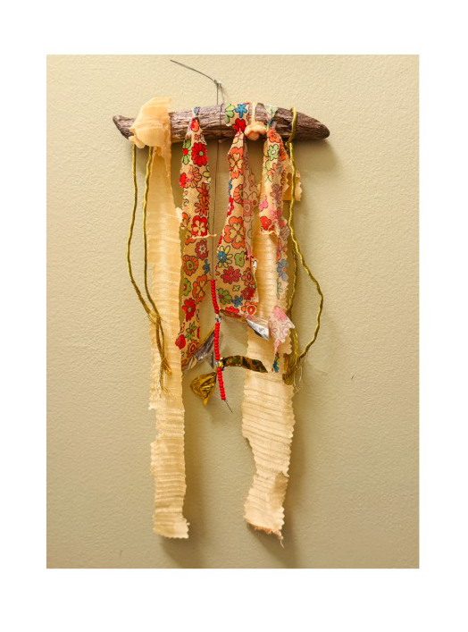 Create a wall hanging from recycled/reused fabric scraps, beads, baubles , and bubble wrap.