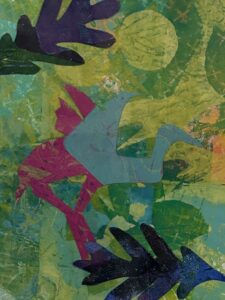 Becca paints primarily in watercolor and acrylics using linear elements within her work to explore rhythmic patterns inspired by music and her environment. Her latest mixed media body of work incorporates discarded materials and elements of her past work and is a reflection of the times and environment we live in.
