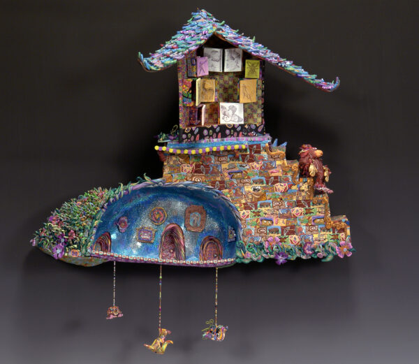 Artist Statement: I get asked a lot if I get ideas from my dreams and the answer is a definite yes. This piece is a perfect example. I have a lot of dreams about fantasy houses – this one had an interesting cave like basement and lots of stairs. Stairs are a common theme in my dreams and seem to always be equated with some sort of struggle to get somewhere. I love to watch how people react to this piece. I think it appeals to the love of doll houses that many of us experienced as a child. I added creatures that hang from the bottom in a way that invites the viewer to play with them and take them around the bottom part of the house.