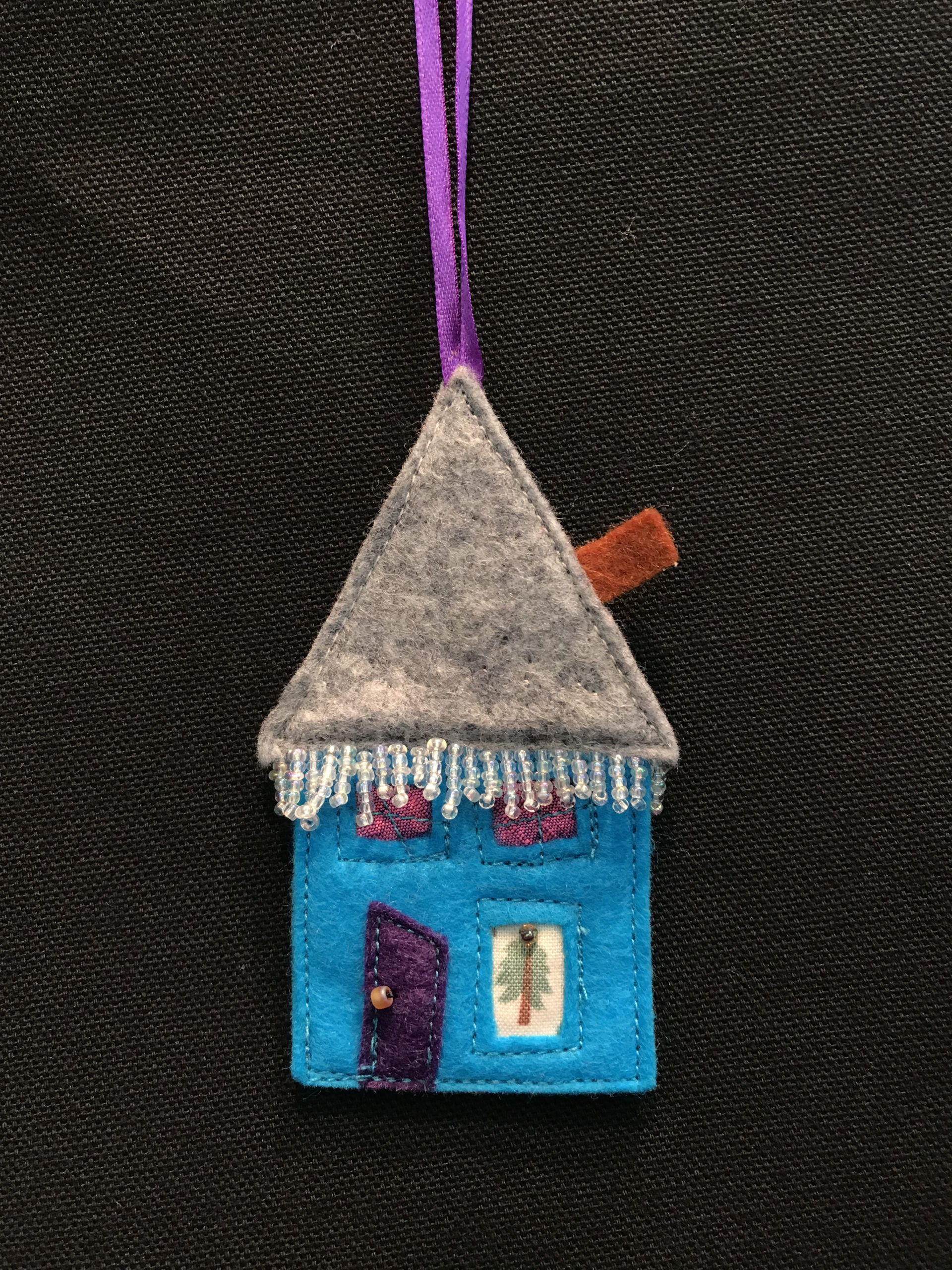 One of a kind wool and rayon felt house ornament. Icicles are hand beaded.