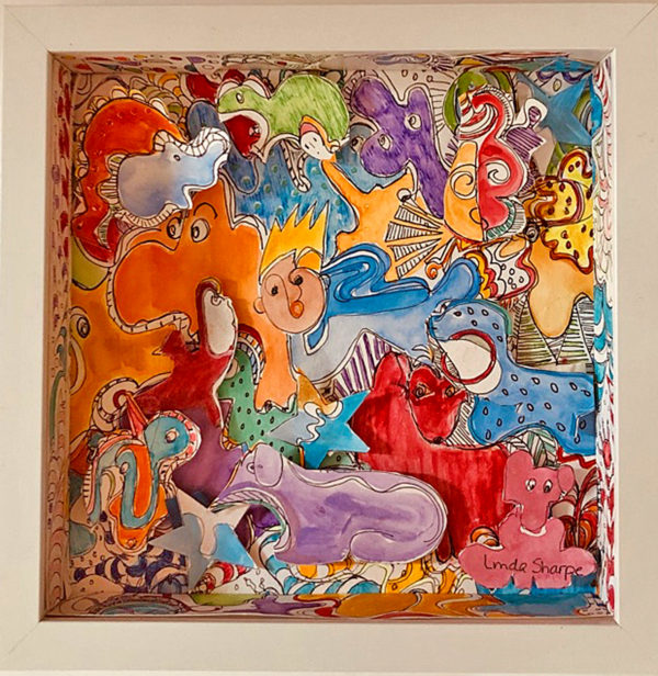 I started doing collage at the beginning of the Covid-19 lockdown. I needed a complete change from painting. Making and cutting up my colorful doodles and old paintings, creating dimension in formerly flat art and pasting creatures, circles and stars on top of each other, made me very happy.