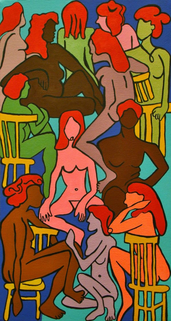 The “Dancing Ladies” reflect my celebration of living, loving and learning that fulfills me while pursuing my creative path. I have used these playful gestural drawings as a starting point and combined them with bold colors to display the feelings of joy and motion while dancing.