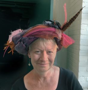 Candy Kuehn creates wearable art, costumes, wall pieces, and sculptures in numerous media. She makes art pieces that are functional, reversible and have multiple uses that sometimes change with the passage of time. Many works live as well on the wall as they do on the body, on the ceiling, on the floor and on the stage. The hats are formed from floral supplies and dyed grasscloth wall covering, decorated with dyed feathersand netting, fake flowers and fabric scraps, and sometimes ribbons .