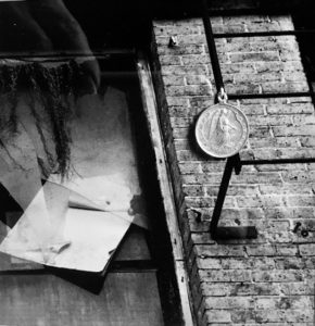 Anne Kleinhenz Title of the Work: “Guardian Angel of the East” from my “Heart Listening” installation concept, is a framed original print from a series made to honor angels of the North, South, East and West. It is a hand made print done in the old school method in a darkroom, printed from a black & white negative. This image was taken along Washington Avenue North in the North Loop of Minneapolis, long before this historic area was given that name. The ladder evokes the proverbial “ladder to heaven” often depicted as angels ascending and descending on their way back and forth, over and over again, from the other side of the veil often known as heaven. The vintage amulet adornment symbolizes a guardian angel in holy action. Doing what angels do. Angels unaware are all around us. Listen to your heart. Be aware of tapping on your shoulders. Angels can show up silently or strongly when we least expect it. Often angels are protectors or guides to help us take steps on the ladder of life adventures that we are constantly climbing in pursuit of the highest good of all living things on our beloved planet. If you live or work in the North Loop, this image will look great in your home or office.It will bring heart-centered protection to any space.