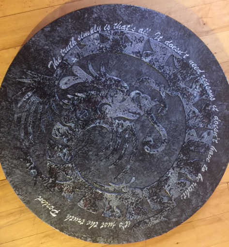 This work is part of a series of experimental paintings dealing with beauty, truth and lies. In these paintings I explore how great minds in history understand the difference between what is real and what is fake. In a political climate where not-so-great minds can make claims like “the truth is not the truth,” it’s helps to fortify our belief systems in the light of minds like Lao Tzu, Epictetus, Emerson and Buddha.