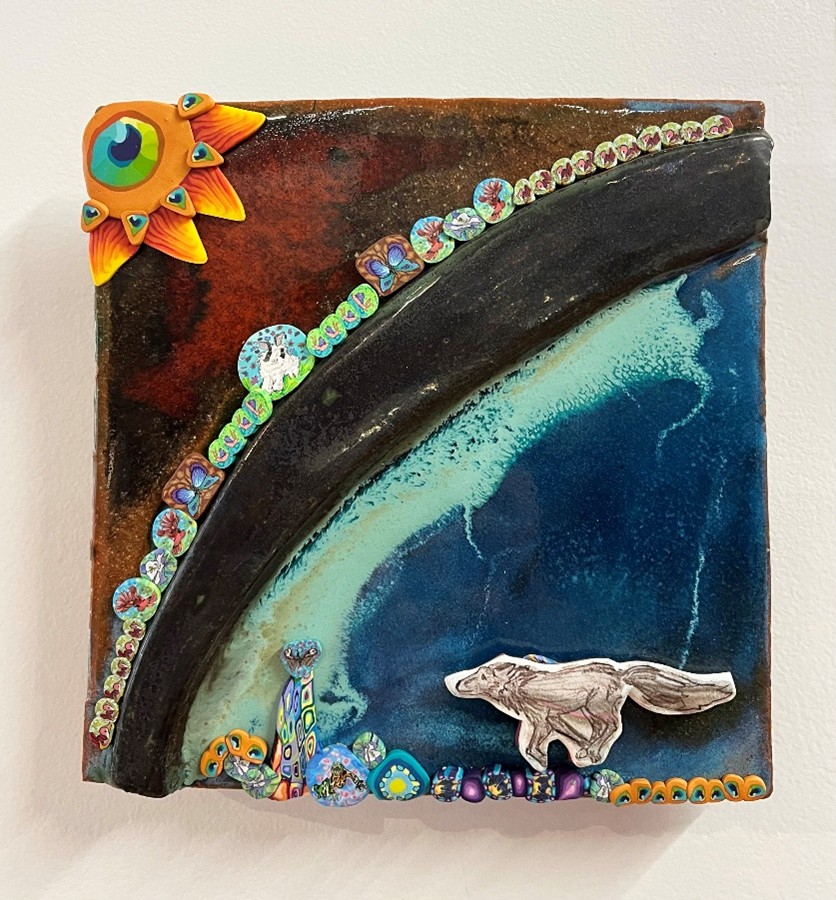I continue to be fascinated by the ecological systems that keep the earth healthy and diverse.  It has been widely studied that when you take a carnivore out of an ecosystem all sectors of that system suffer not just those directly related.  I created this piece while thinking about this reality.  The tile was created by my husband Josh and was leftover from a project in our own house.  I wanted the tile to live on in a new iteration with the additions of my polymer clay pieces.
