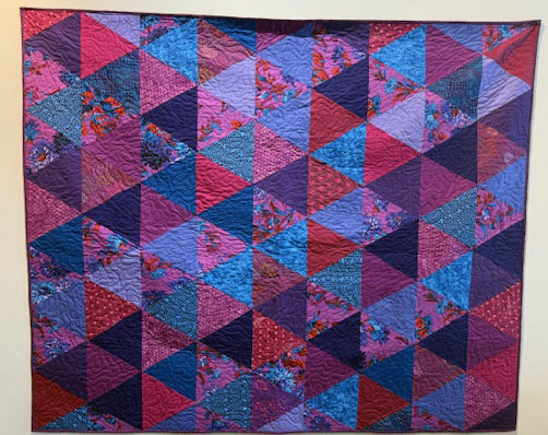 fabric designed by Kaffe Fassett. He is a master of color and his prints turned the quilting world upside down when he arrived on the scene in the early 90’s. Prior to that, most quilters used fabrics that were mostly reproductions of antique prints or sweet florals in predictable color combinations. Fassett changed all that. He used motifs pulled from cultures around the world  and printed them in complex and surprising colors. When I discovered his fabrics, I felt like I’d  found what I’d been waiting for. I’ve been using his prints as a starting point for many quilts ever  since.   This quilt uses the richness of purples, violets, and blues and the simplicity of a simple repeated  triangle to showcase the idea of color.