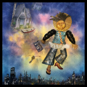 This mixed media work of art is a depiction of homelessness. The viewer can sense the young woman’s inherent beauty and goodness. She, who has so much to give the world, deserves to receive care and nurturing. In the upper left corner is the home she dreams of. Across the bottom of the image we see the city at night. Though sparkling with light, it may at times seem like a harsh and unforgiving environment. Yet the woman is depicted in dramatic color, full of life and hope, reminding us that the human spirit will prevail, and all hardships are temporary. In time, she is sure to find the friendship and the shelter that she seeks.
