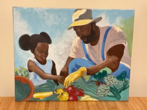 This painting set, “In the Garden”, is a set of 12 paintings from my Puzzle Series. It was an attempt to capture the joy of urban gardens. Urban gardening is promoted as a pastime and as a way to grow fresh foods that may not otherwise be affordable in my community. Inner cities often are food deserts and this is a way to promote healthy food choices and healthy spring and summer activities.