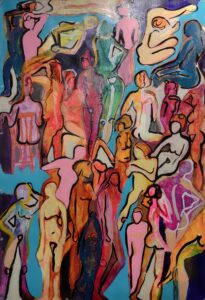 This work stems from a celebration of People, Community and Art. It really started with a conversation I was having with another artist. We were talking about painting the dance. I started thinking of how I would paint dancing.