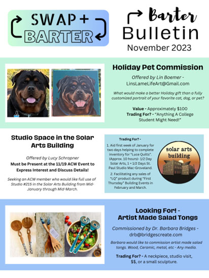 “Introducing Art to Change the World’s “SWAP and Barter!” ‘SWAP + Barter’ is an initiative started to explore the concept of bartering within our local community, through trading goods and services with other artists and community members. “SWAP + Barter” is a multi-faceted project, with opportunities for artists to trade in-person or online, for physical artistic goods, commissions, or services that those in our community may need a little extra help with. The first portion of this project was launched with our first in-person trading event at ACW’s New Member Party on November 19th! Our next steps include designing an online forum so that SWAPs can occur without the hassle of an in-person event, as well as continuing to post the “SWAP + Barter Bulletin” monthly in the ACW Newsletter! Keep an eye out at the start of Summer 2024 for our webpage launch!